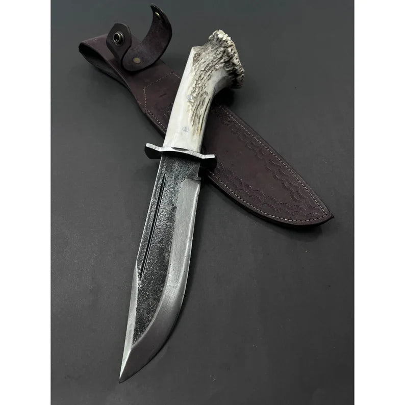 Χειροποίητο σφυρήλατο ατσάλινο μαχαίρι Bowie: λαβή από κέρατο ελαφιού, δερμάτινο μανίκι